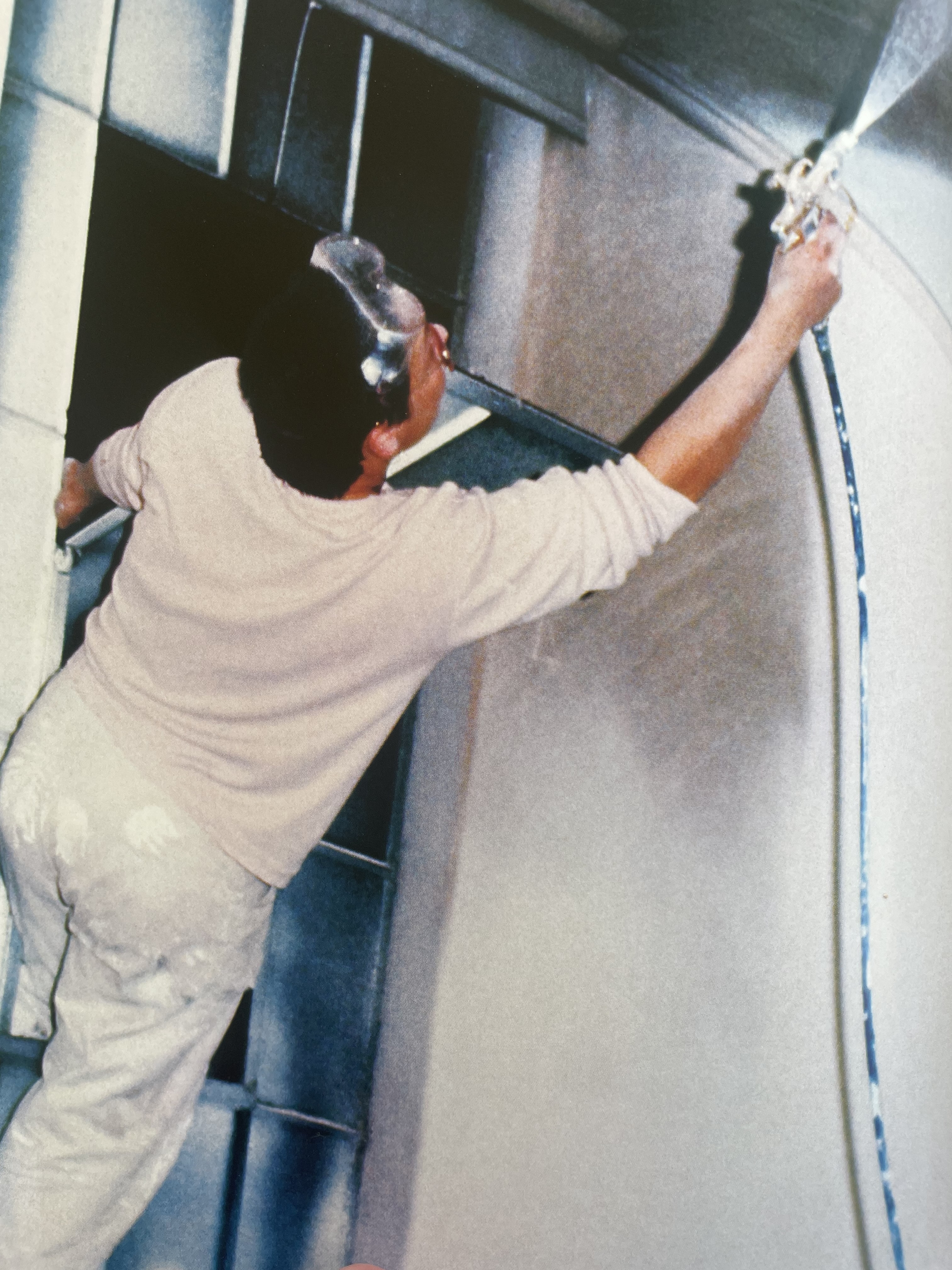 Cheryl Stannack spray painting the ceiling of the Woman’s Building, 1975, Woman’s Building Image Archive.